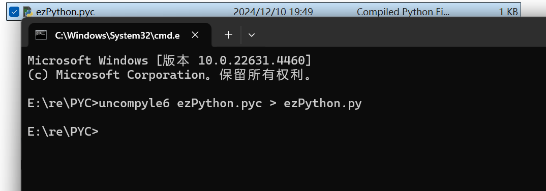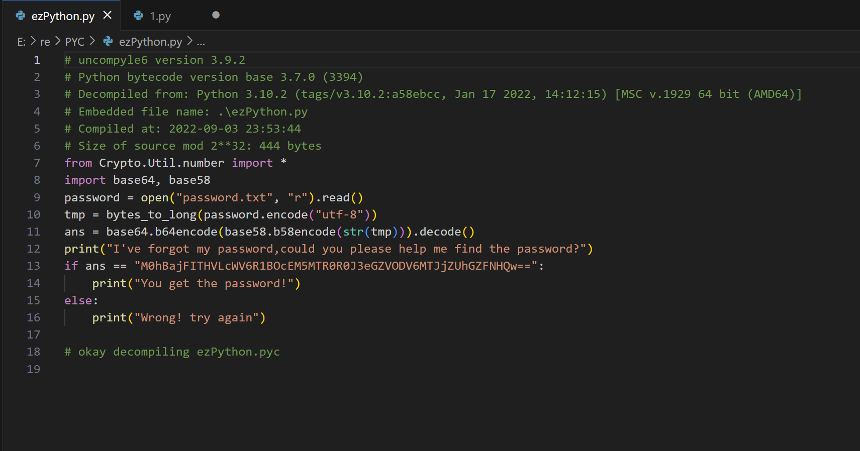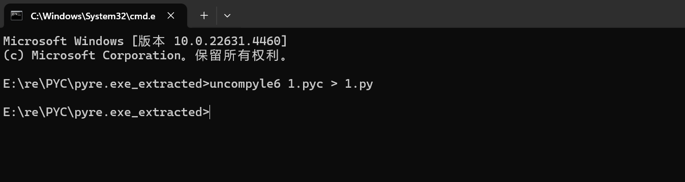 将所得的pyc文件与pyinstxtractor.py文件放在一起,打开cmd,输入 uncompyle6 文件名.pyc > 文件名.py 再回车一下,就可以得到py文件。得到py文件后,我们用VScode打开,就可以看到庐山真面目了。