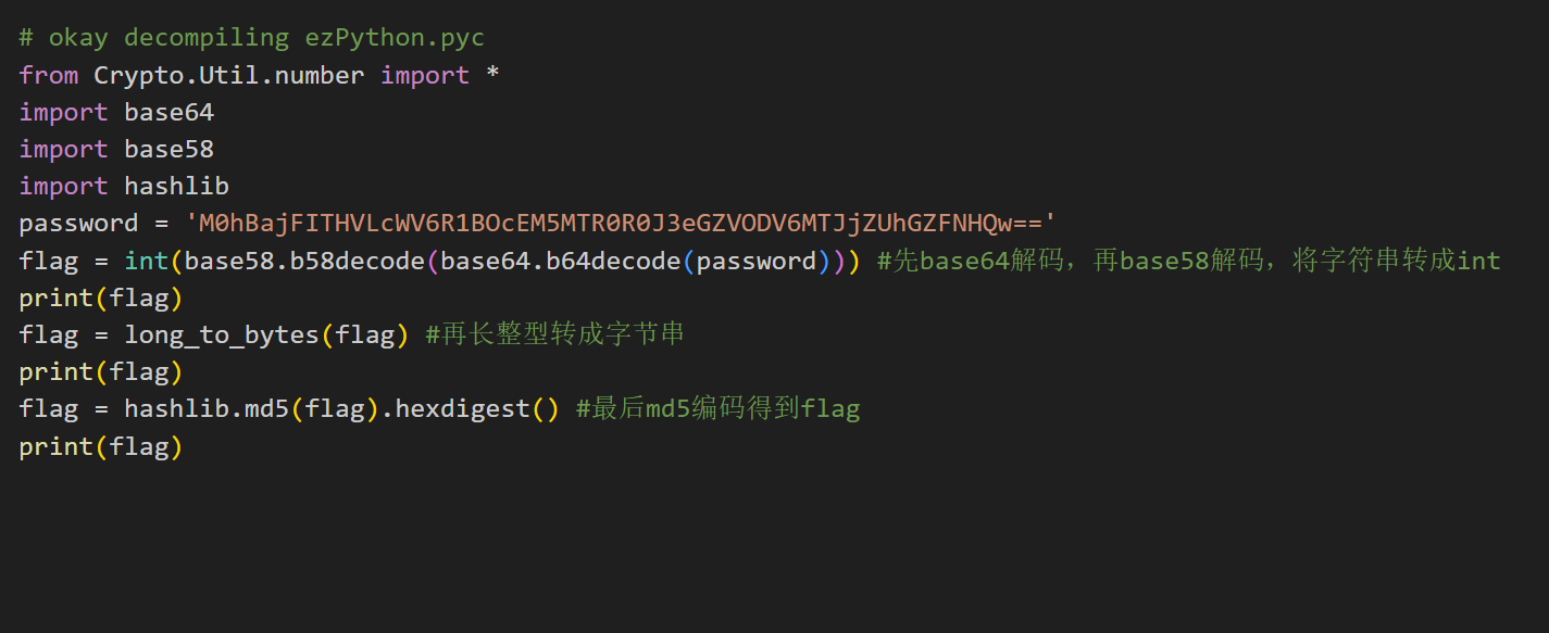 ans = base64.b64encode(base58.b58encode(str(tmp))).decode()#先使用str(tmp)将上一步得到的长整型数字转换为字符串形式,再base58,再base64编码