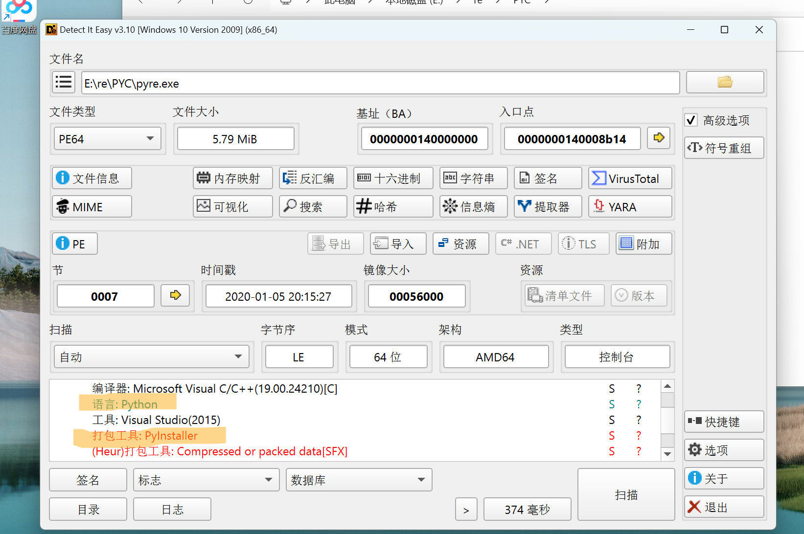 先放到查壳软件里查,可以看到语言是Python,打包工具是Pylnstaller,就是考察exe转pyc,转py