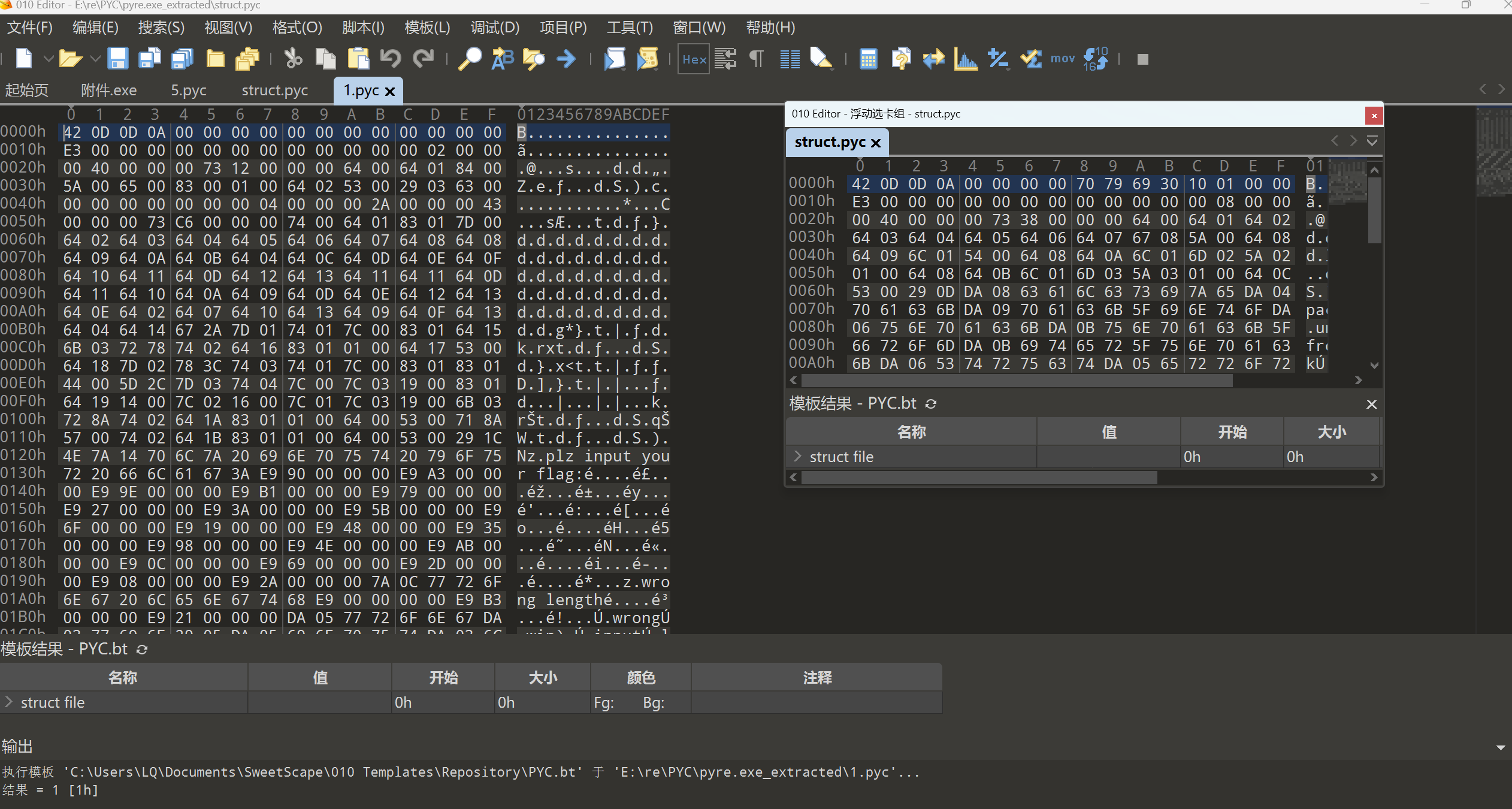 会看到一个新的与exe文件同名的文件夹,点进去查看会看到struct.pyc文件,胆大心细一下,找到你觉得可疑的文件,这个文件夹里明显是1.pyc文件。struct.pyc文件是标准正确的的文件头,1.pyc和struct.pyc需要放到010里面查看,1.pyc是否有文件头,文件头是否与标准的文件头相同。改成一致的后保存。
