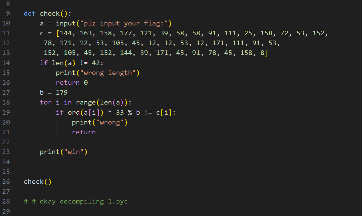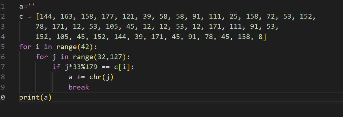 进行分析,可以得知a就是flag,flag的长度是42,flag中的每个元素的Unicode值与33相乘再与179取余要等于c[i]。