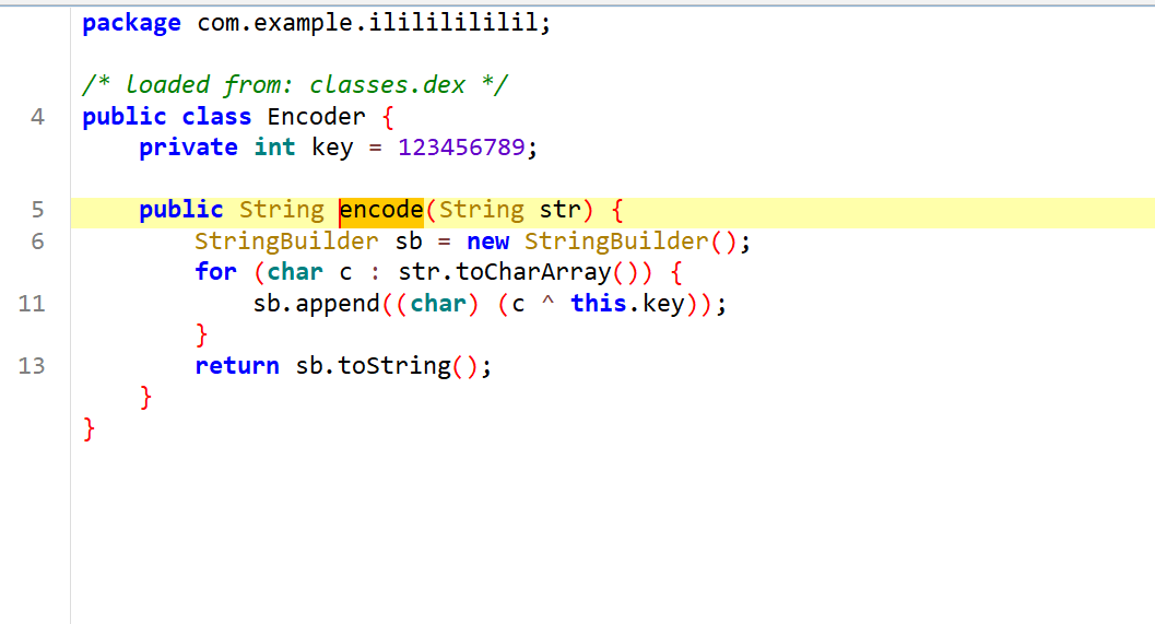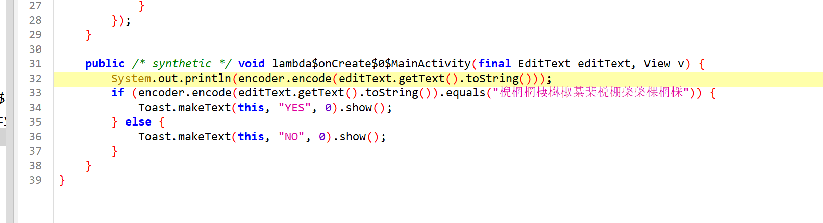 这是获取用户在 EditText 中输入的文本然后将其进行编码,编码之后与特定字符串 "棿棢棢棲棥棷棊棐棁棚棨棨棵棢棌"进行比对,如果正确输出yes,那现在就要找出加密方式
