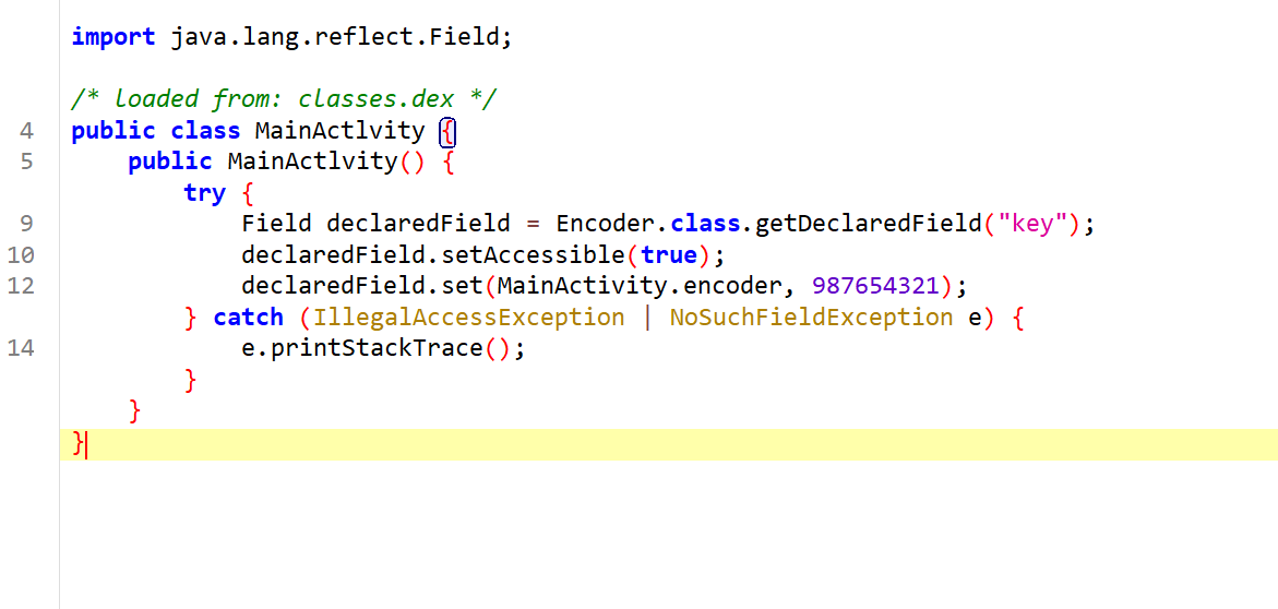 不容忽视的是在目录下找到了一个MainActlvity类,它在尝试通过反射机制修改 Encoder 类的私有字段 key