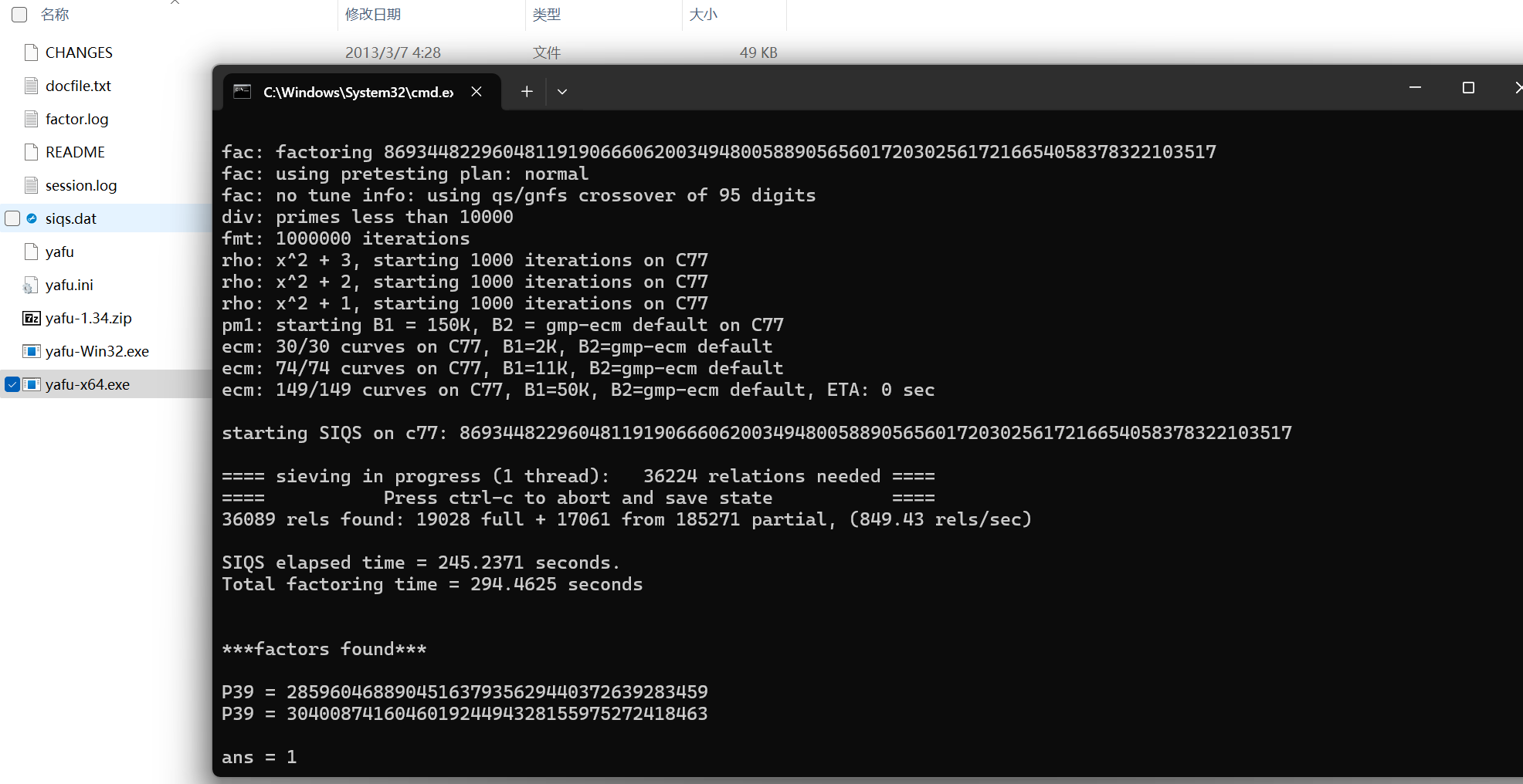然后使用RSA因数分解工具yafu将n进行分解,输入命令