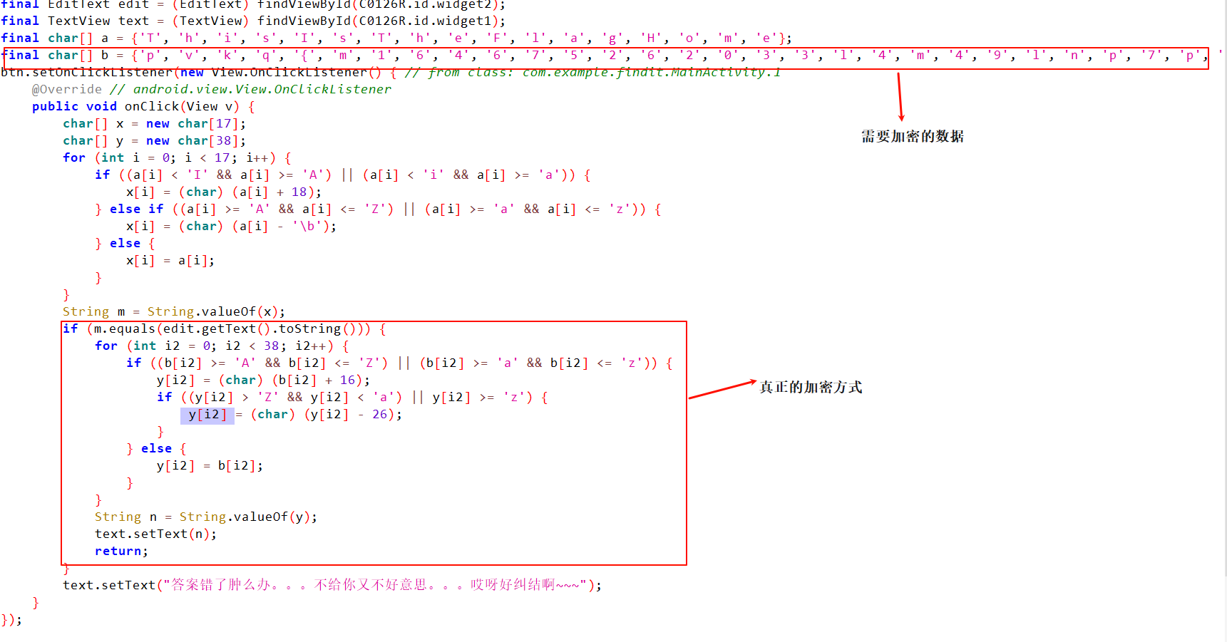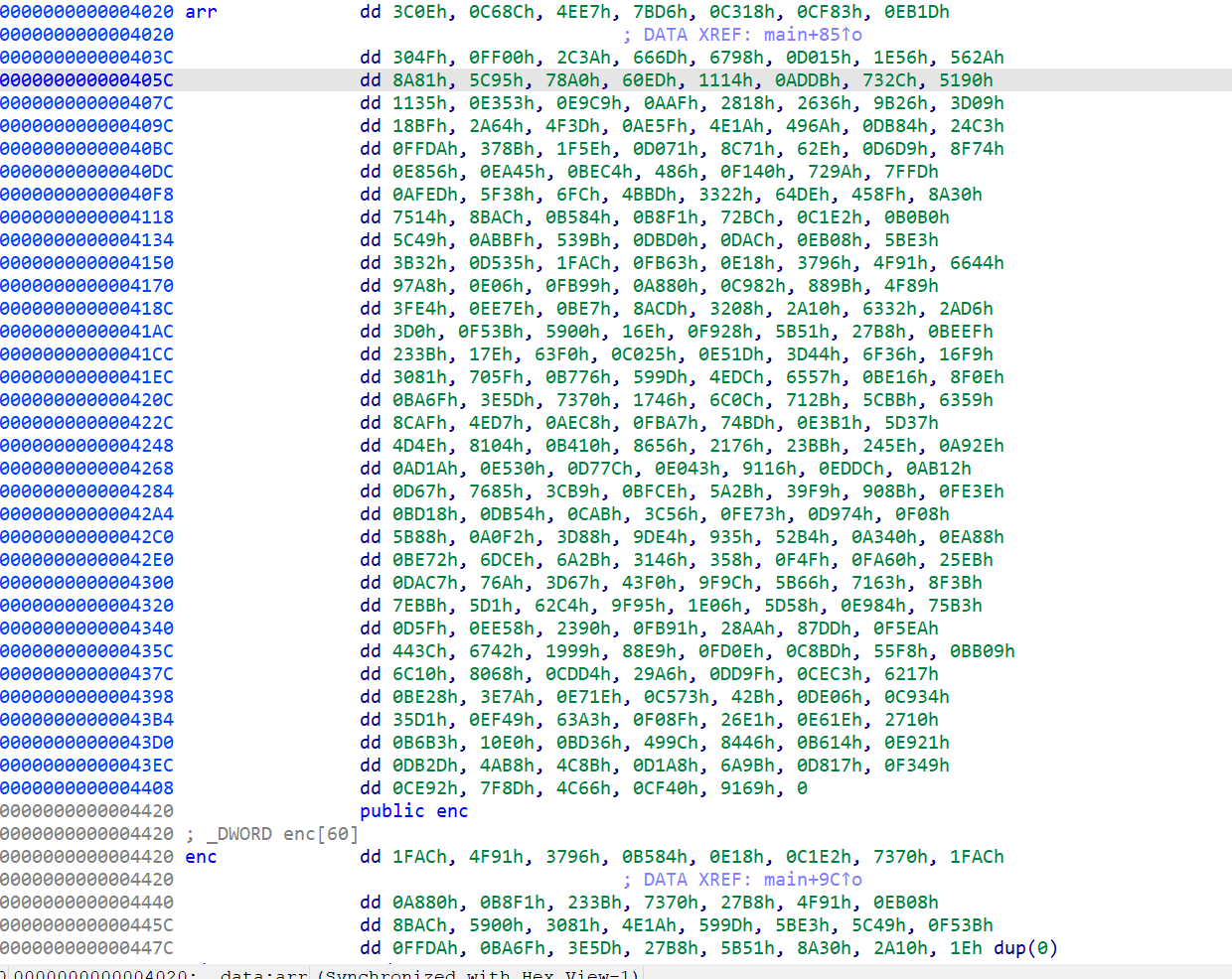 简单来看就是i与s[i]异或得到新的下标,arr[v9]=enc[i];只要找到arr[]和enc[],并找到他们都相等时的下标再进行异或,就可以得到输入的flag。