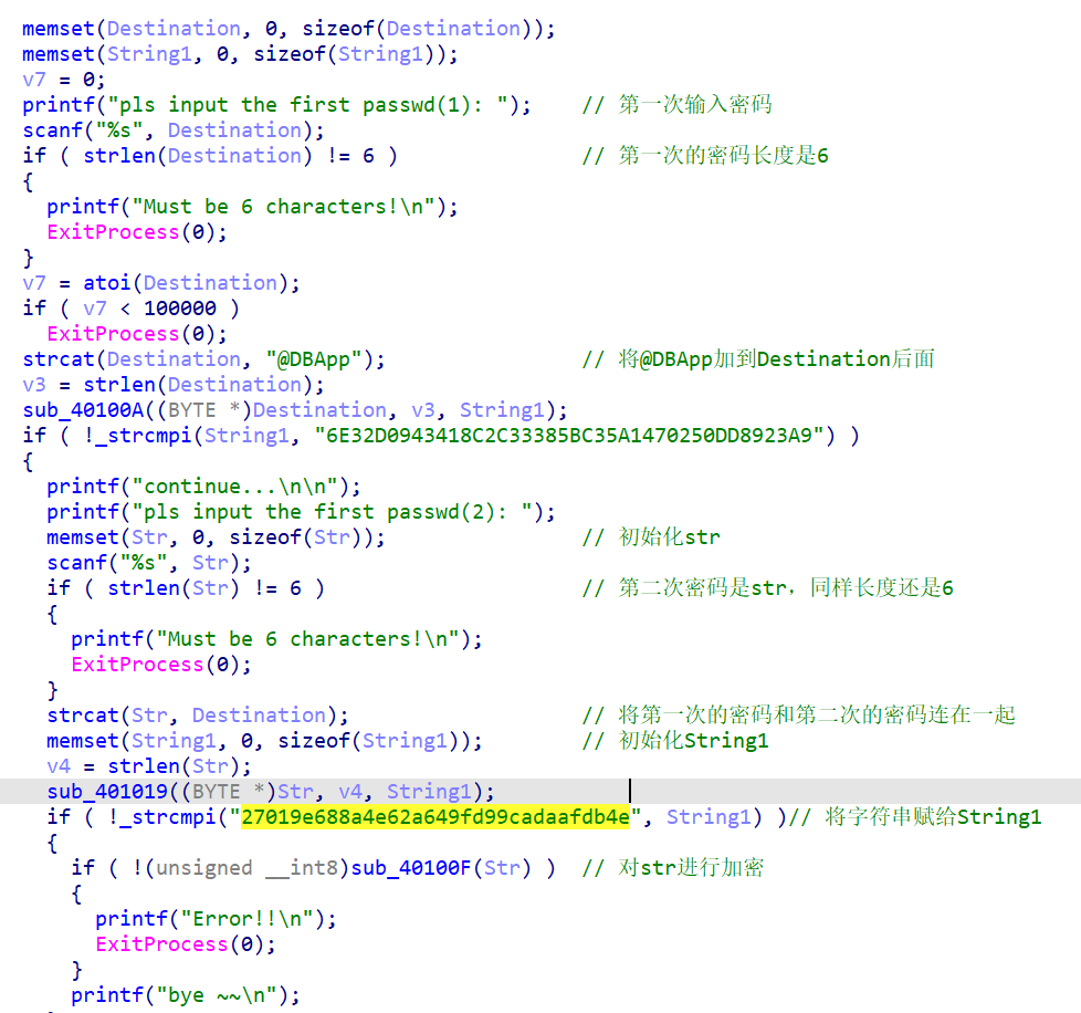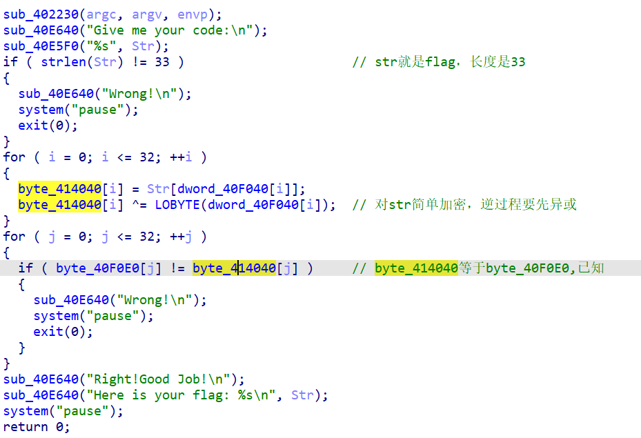 需要注意的是在逆向解密时,要注意先异或赋值给dword_40F040,再进行下一步时,Str[dword_40F040]里的dword_40F040还是原来的值
