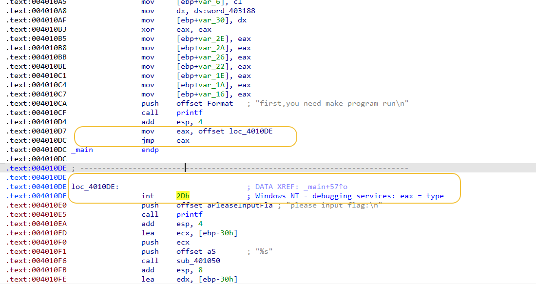 这是跳转到loc_4010DE 处执行,关键是这里的指令是int 2Dh。