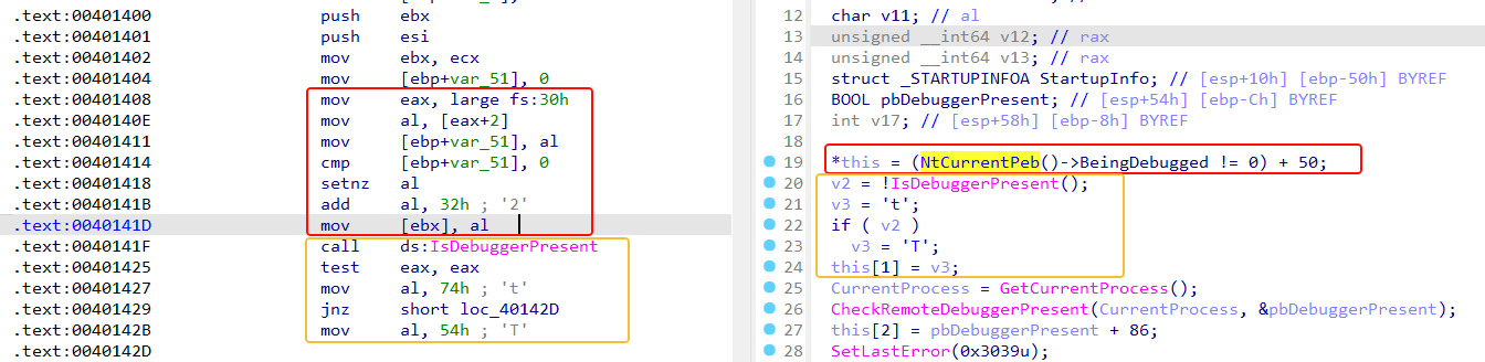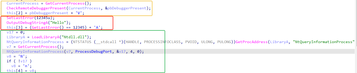 第二个是IsDebuggerPresent,如果当前进程没有被调试,IsDebuggerPresent() 返回 0,赋值 84(’T’)