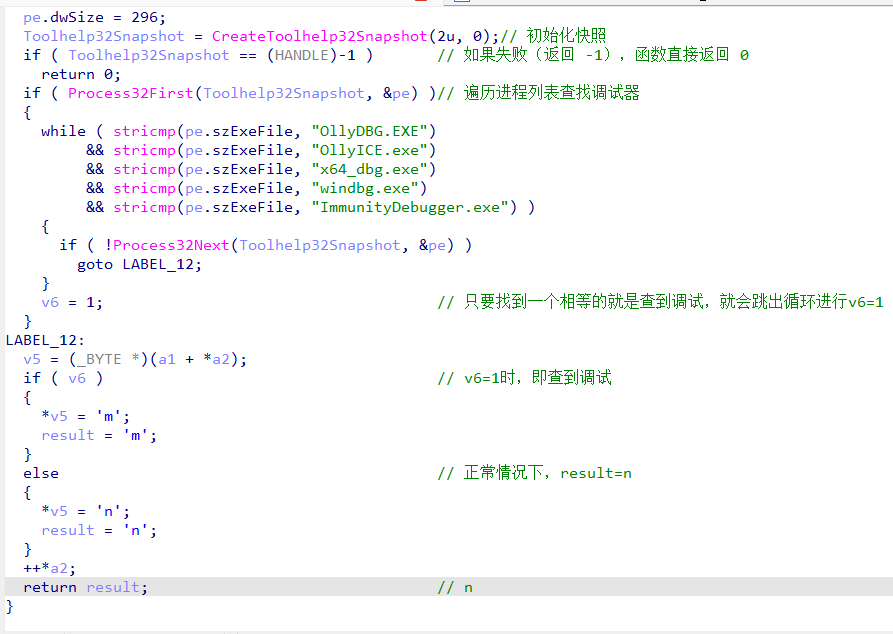 如果 v13 - pbDebuggerPresent < 0xFF:表示运行非常快 → 没被调试 → 'n'