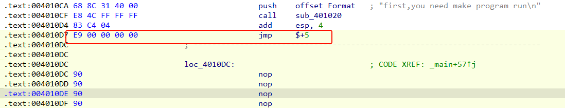 也可以把 jmp eax 指令改为 nop 填充,意味着程序将不再跳转,而是继续顺序执行 loc_4010DE 后的代码。