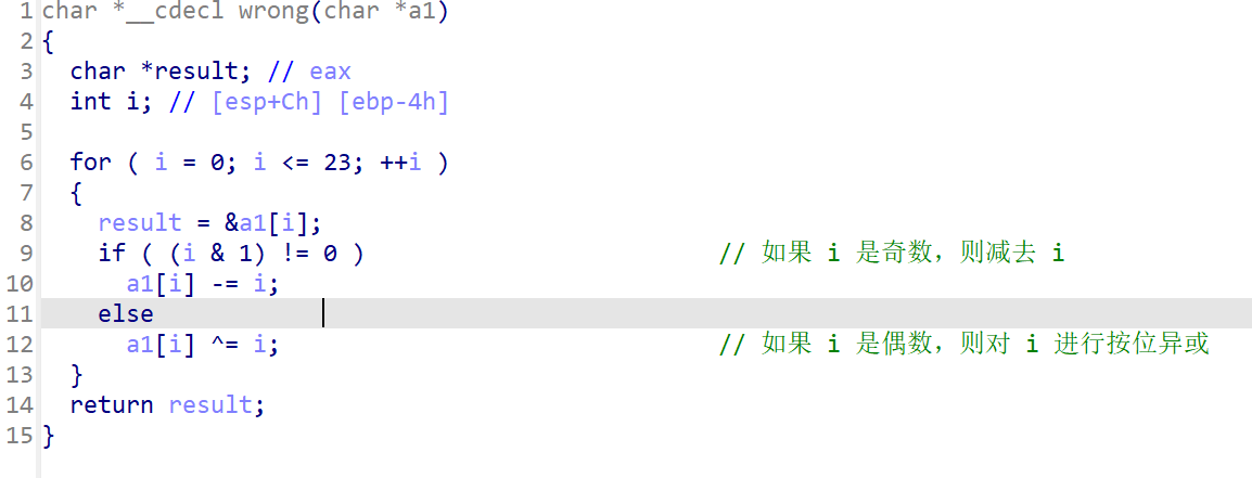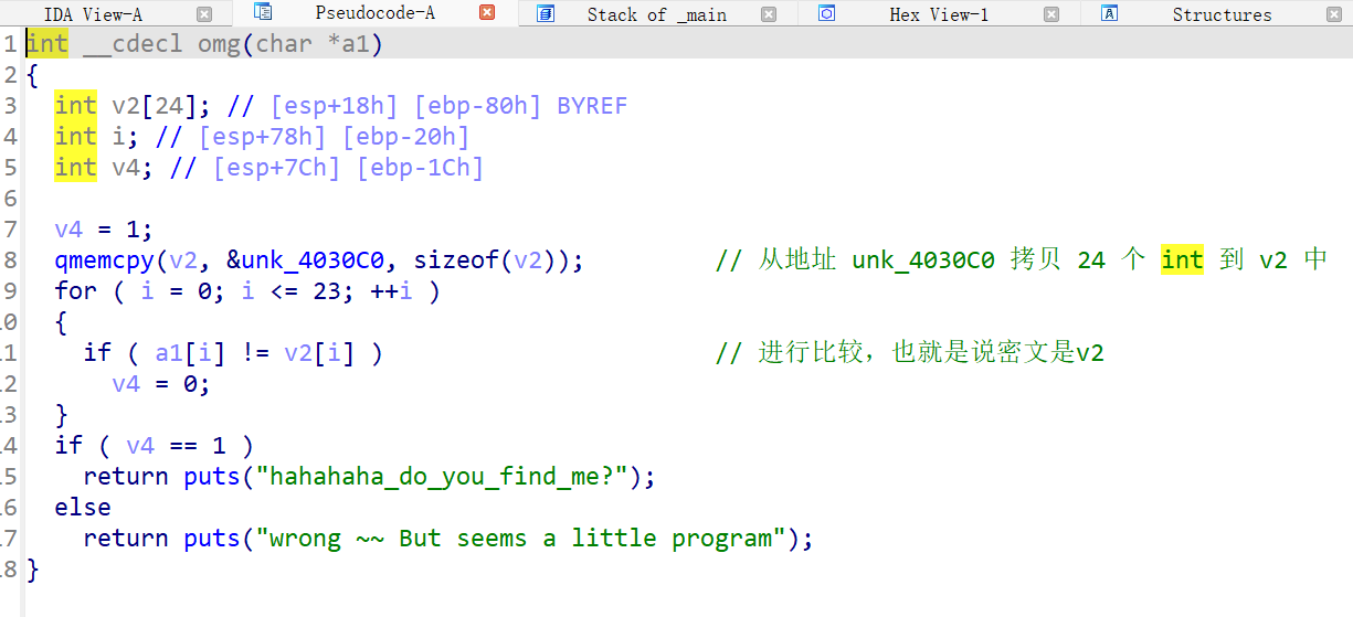 然后按F5进行反编译,得到这个函数的内容了,进行分析。
