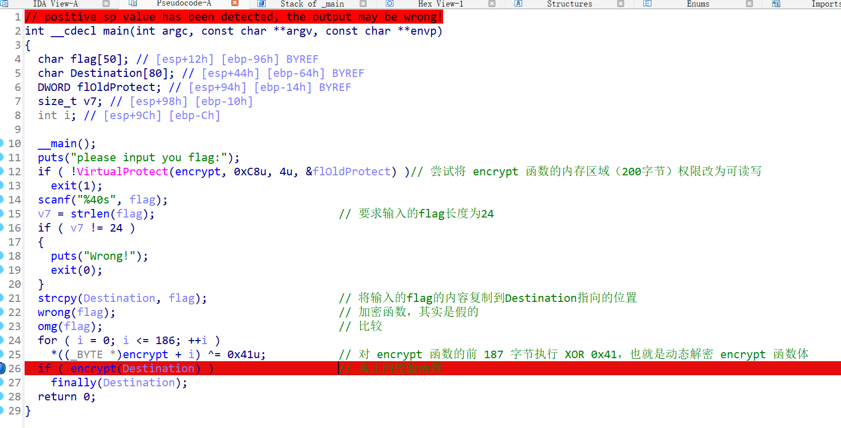 会发现有VirtualProtect 函数,那么这个大概率就是一个smc了。先进行分析,也就是要输入一个24位的flag,然后通过wrong(flag)进行加密,再通过omg(flag)进行比较,先看看加密函数。