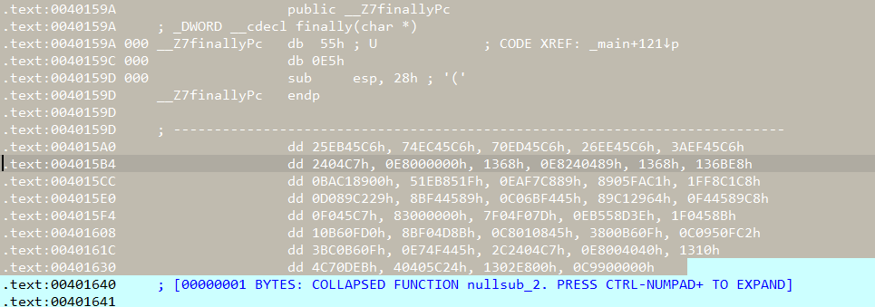 点进去发现,IDA反汇编错误,下面有很大串的数据都没识别出来,我们就将函数头按U解除定义,然后从函数头一直选到0x00401630这里结束,按C让IDA强制重新解析成代码。