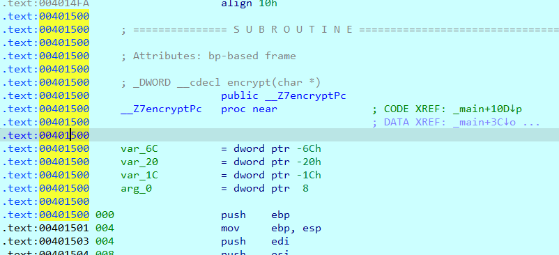 我们可以在if ( encrypt(Destination) )这里下断点,然后动态调试看真正的加密方式。动态调试时,会提示我们输入flag,这里任意输只要长度是24就好了。然后直接查看汇编,找到encrypt函数是public __Z7encryptPc