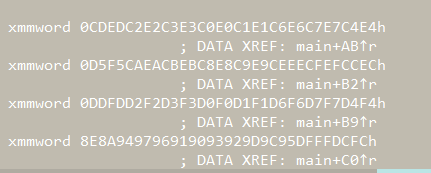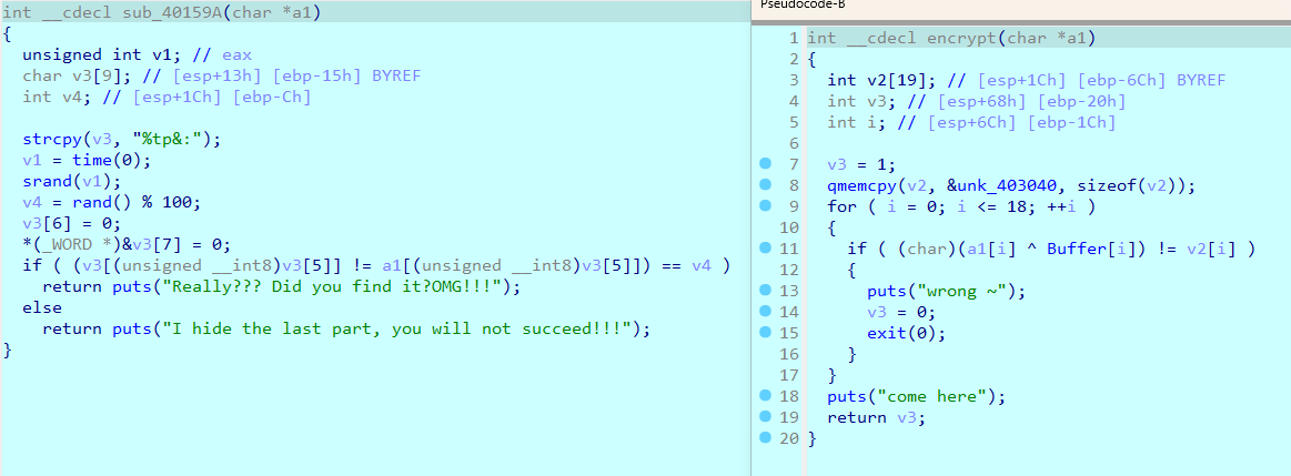 这就是真正的加密函数了,分析一下,右边的是将flag[i]和Buffer[i]进行异或得到密文v2[i],我们可以从unk_403040处找到v2密文,也能直接点击Buffer得到这个字符串是'hahahaha_do_you_find_me?',那么我们就能得到前19位的flag,只要将v2[i]和Buffer[i]进行异或就好了。我们知道这个flag一共是24位,还有5位不知道,看左边的加密函数。这个v3密文正好是5位,但是这个函数并没有什么卵用,我们就进行猜测这个是flag与某个值进行异或得到了这个密文。已知flag最后一位一定是右括号”}”,那么我们将这个和密文异或就能得到某个值了。