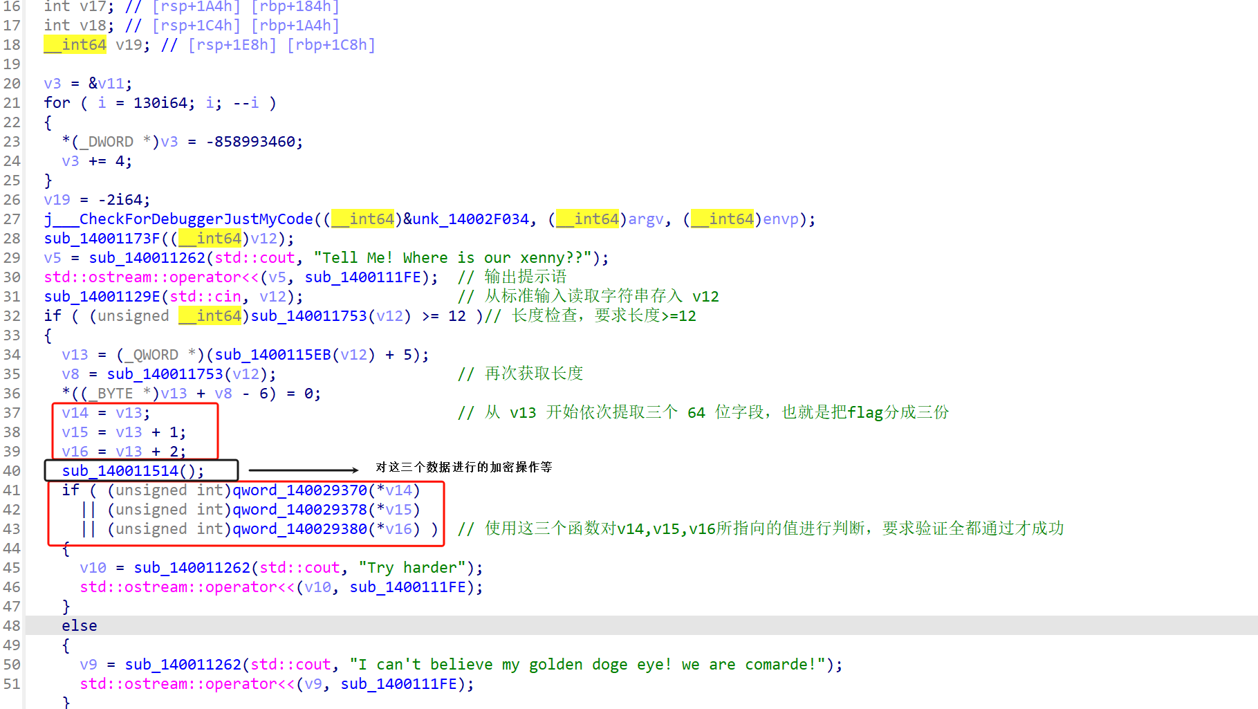 这个是将输入的flag放到v12里面,长度要大于等于12,并且将这个分成三份,分别放到v14,v15,v16里面。然后进入到一个函数里面,最后的if条件是进行检测判断,通过这三个函数来对flag的三部分进行检测。那我们要进入到sub_140011514()里面来看看它进行了什么操作,里面有没有关于这三个函数的信息。