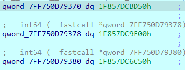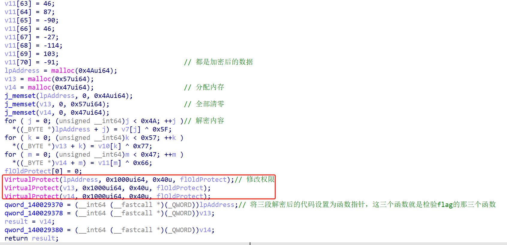 发现了VirtualProtect 函数,这就说明了考察的是SMC,上面的数据都是加密后的,下面是解密的内容,我们可以通过动态调试的办法找到解密后的数据,最后的那三个函数就是main函数里进行校验flag的函数。我们在 qword_140029370 , qword_140029378 ,qword_140029380 都下上断点,进行调试。