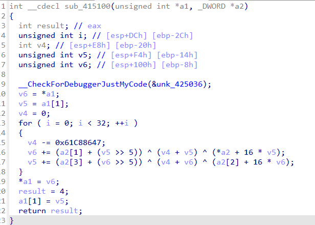 发现sub_411302(v6)函数点开后不能正确的反编译。先看看TEA函数吧,sub_411523((int)&v7, (int)v9);输入的key在TEA加密后必须输出v7 == 1627184887  // 0x610B6A77,v8 == 37149676    // 0x0235AC4C 这两个特定数值,这是密文,利用它来解密,会得到两个数据,其中一个是v8=4,那另外一个就是v7=key了。