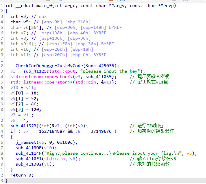 这个题是两部分组成,第一部分通过TEA解密要找到密钥,输入密钥正确后,我们才能进入第二部分输入flag以及flag的验证。