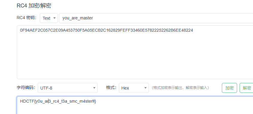 这是标准的RC4对输入的flag进行加密,把加密后的结果v15与v16进行逐字节比较,如果完全匹配,就打印 right!!!!,那么v16就是密文了,密钥就是v13"you_are_master"。