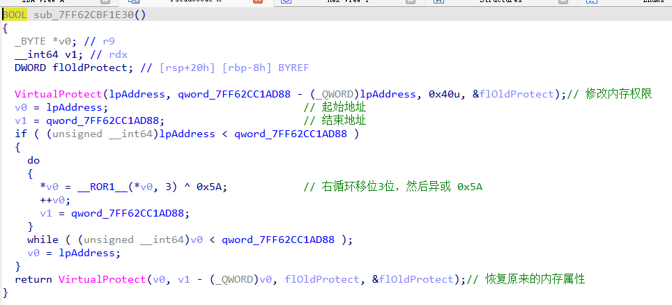 发现这里有VirtualProtect 函数,修改了起始地址和结束地址的权限,进行了解密,所以这个是数据的解密函数。