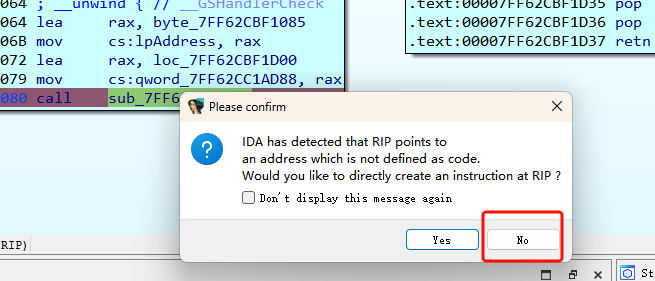发现这里有很多大块的没有被识别出来的数据,不是花指令的话,那就是smc了。看到上面调用了解密函数,我们可以使用动态调试dump出来。在解密函数处打上断点,进行调试分析。提示输入flag时,随便输就好了,这个不影响后续的分析。我们按F8进行单步步过,这时候会出现一个弹窗,意思是是否让IDA自己根据RIP生成代码,这里选no,因为IDA不知道哪里是代码,哪里是数据,如果根据RIP进行分析,就可能会错误的把数据当成代码,从而整个main函数结构就被拆分了。