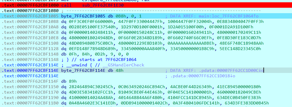 v4里面存放的是用户输入的flag,知道lpAddress和 qword_7FF62CC1AD88分别是起始和结束地址。然后看看sub_7FF62CBF1E30()函数。