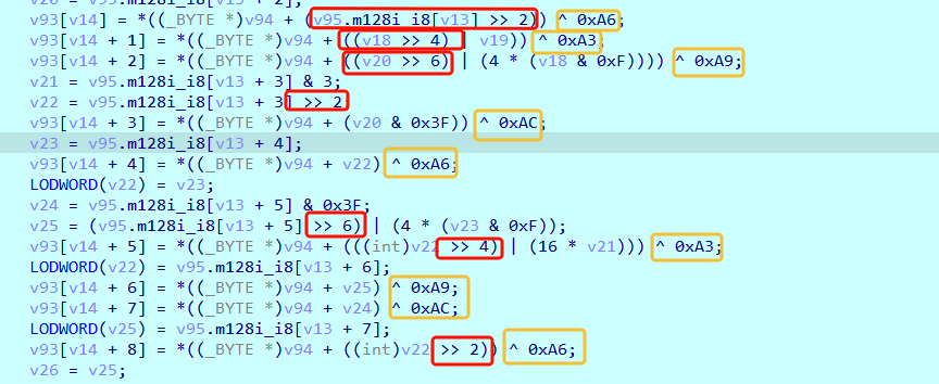 这些>>2 , >>4 , >>6 , &3 , &0xF , &0x3F , *16就是<<4,(v*(2^n)==v<<n )这看起来就像是base64从3 * 8,到4 * 6的实现。