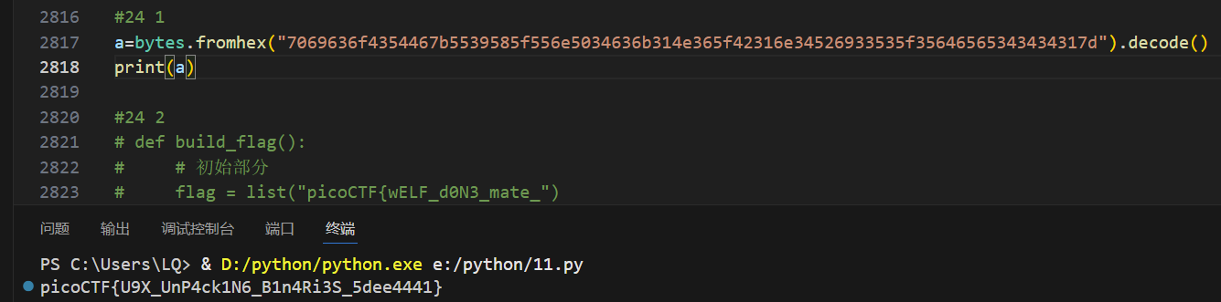 | 1 | a=bytes.fromhex("7069636f4354467b5539585f556e5034636b314e365f42316e34526933535f35646565343434317d").decode() |