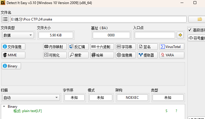 下载题目附件得到一个无后缀名的文件,先进行DIE查壳,发现很特别的是文件类型是数据。这说明这个文件 不是一个有效的可执行文件(ELF / PE),它可能是: