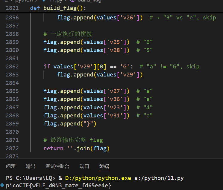分析:这个flag分为两部分,一部分是v22=”picoCTF{wELF_d0N3_mate_”,另一部分需要进行条件拼接。