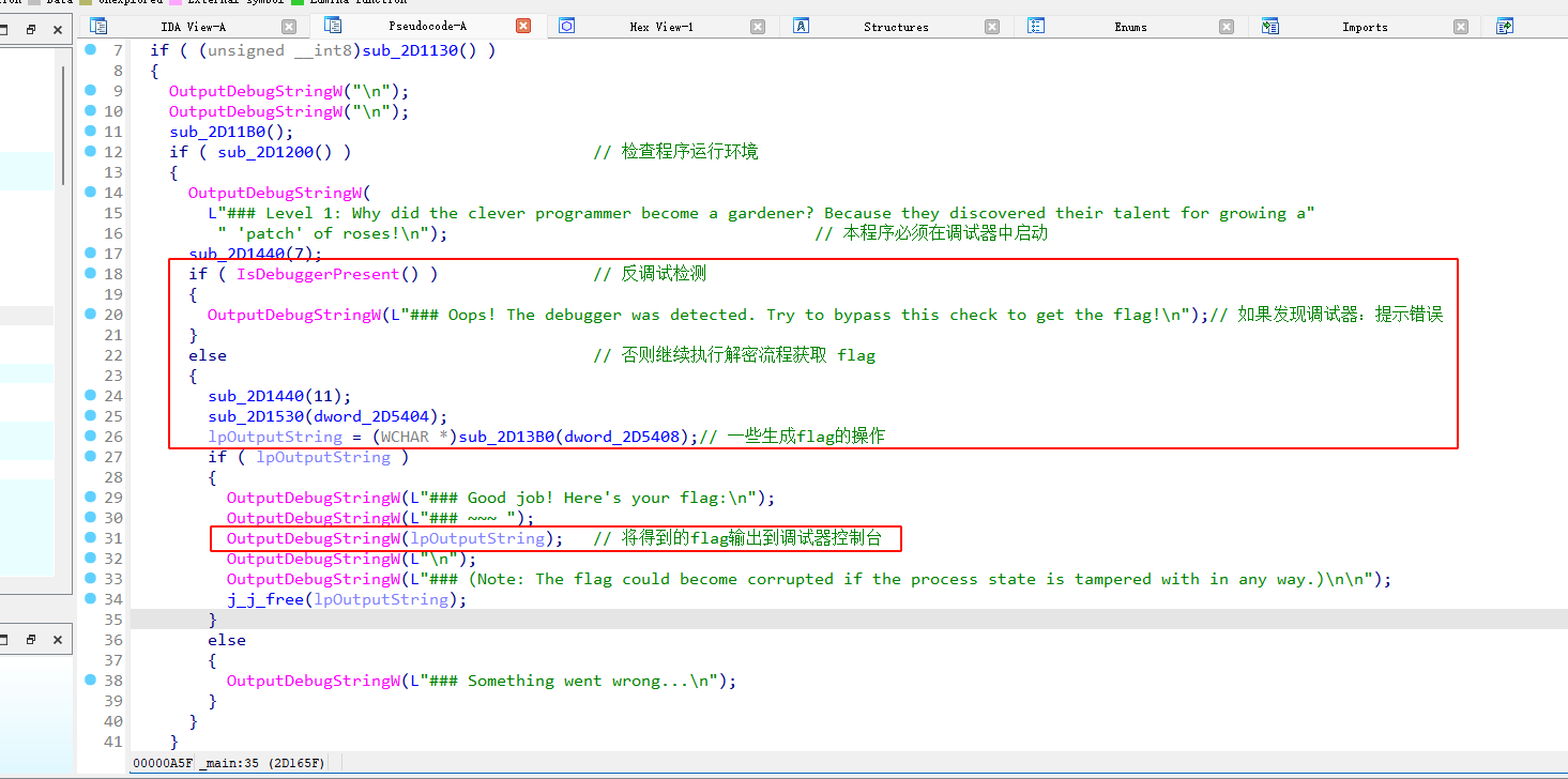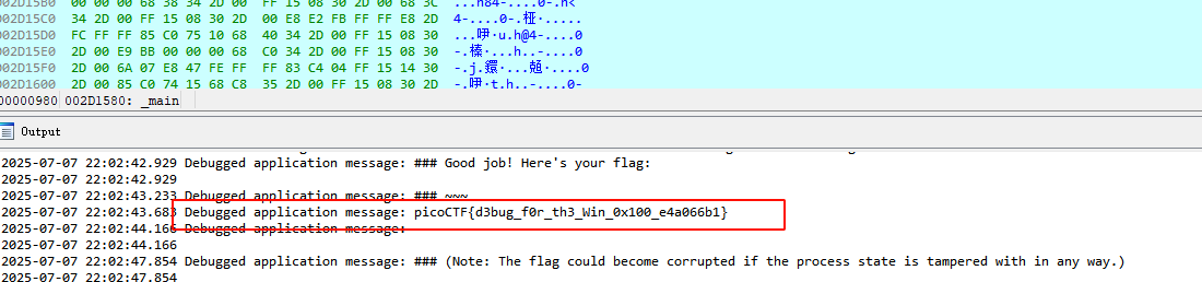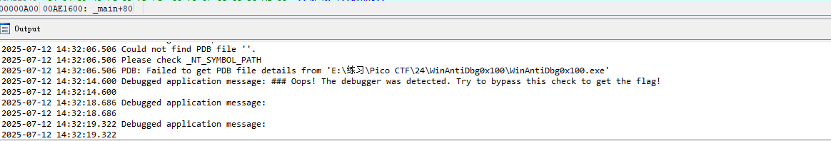 这个主函数逻辑清晰,主要是要在动态调试中要绕过反调试,就能在Output窗口得到flag