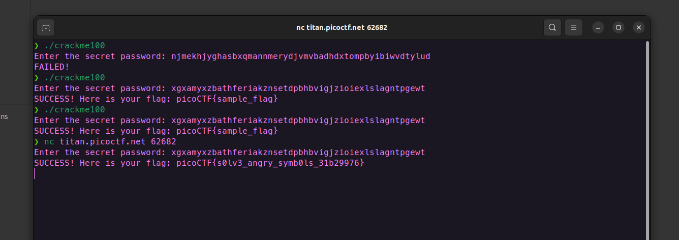 A classic Crackme. Find the password, get the flag!Binary can be downloaded here.Crack the Binary file locally and recover the password. Use the same password on the server to get the flag!