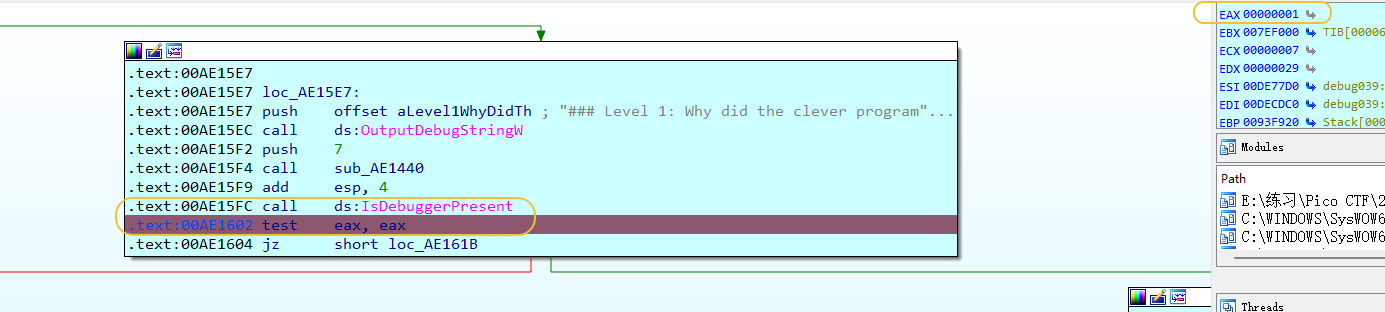 手动修改EAX的值为0,可以绕过反调试