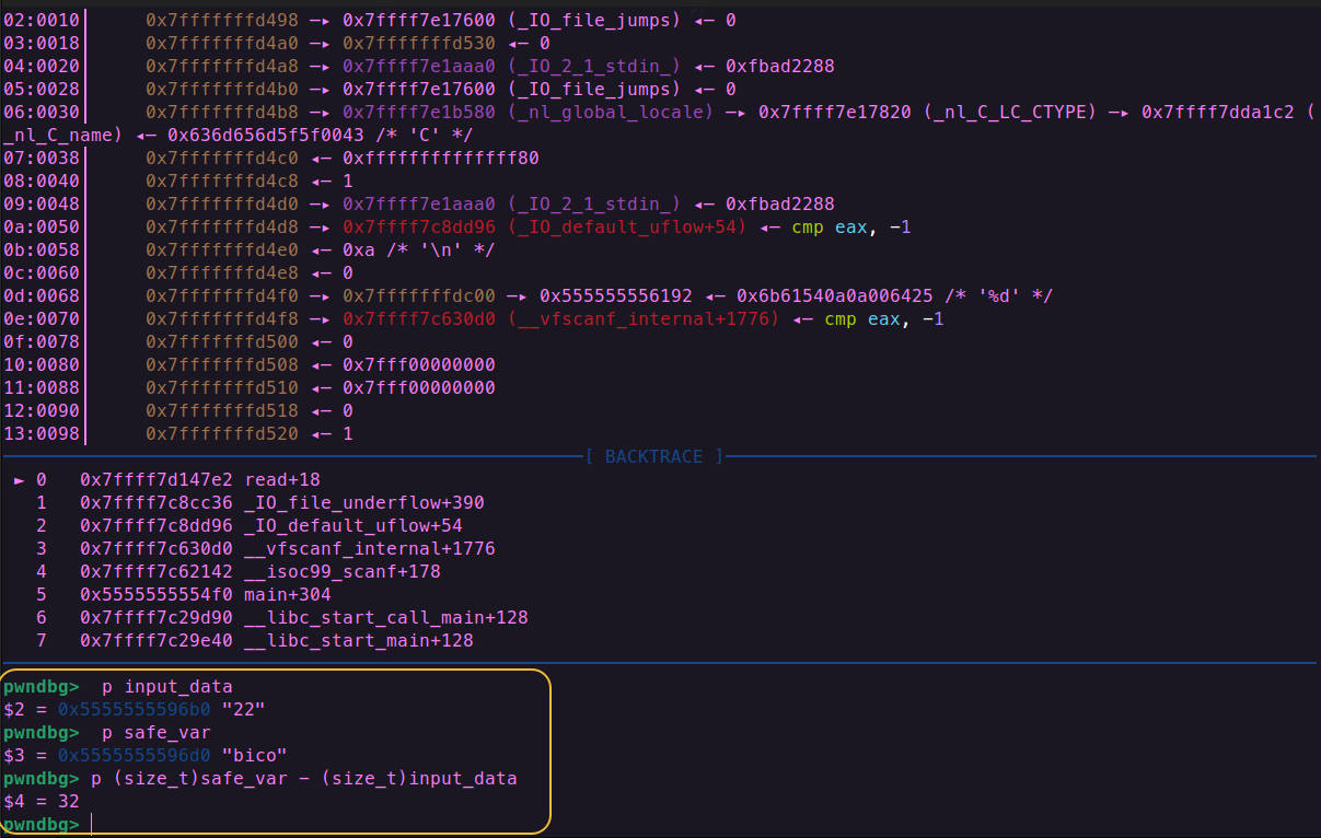 使用gdb进行调试计算从input_data到safe_var的偏移