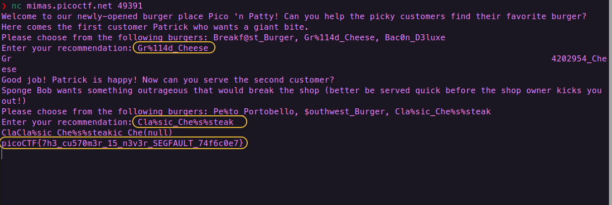 必须要输入菜单选项里的其中一个,输入Cla%sic_Che%s%steak,会把你的输入 当作格式化字符串 传入 printf