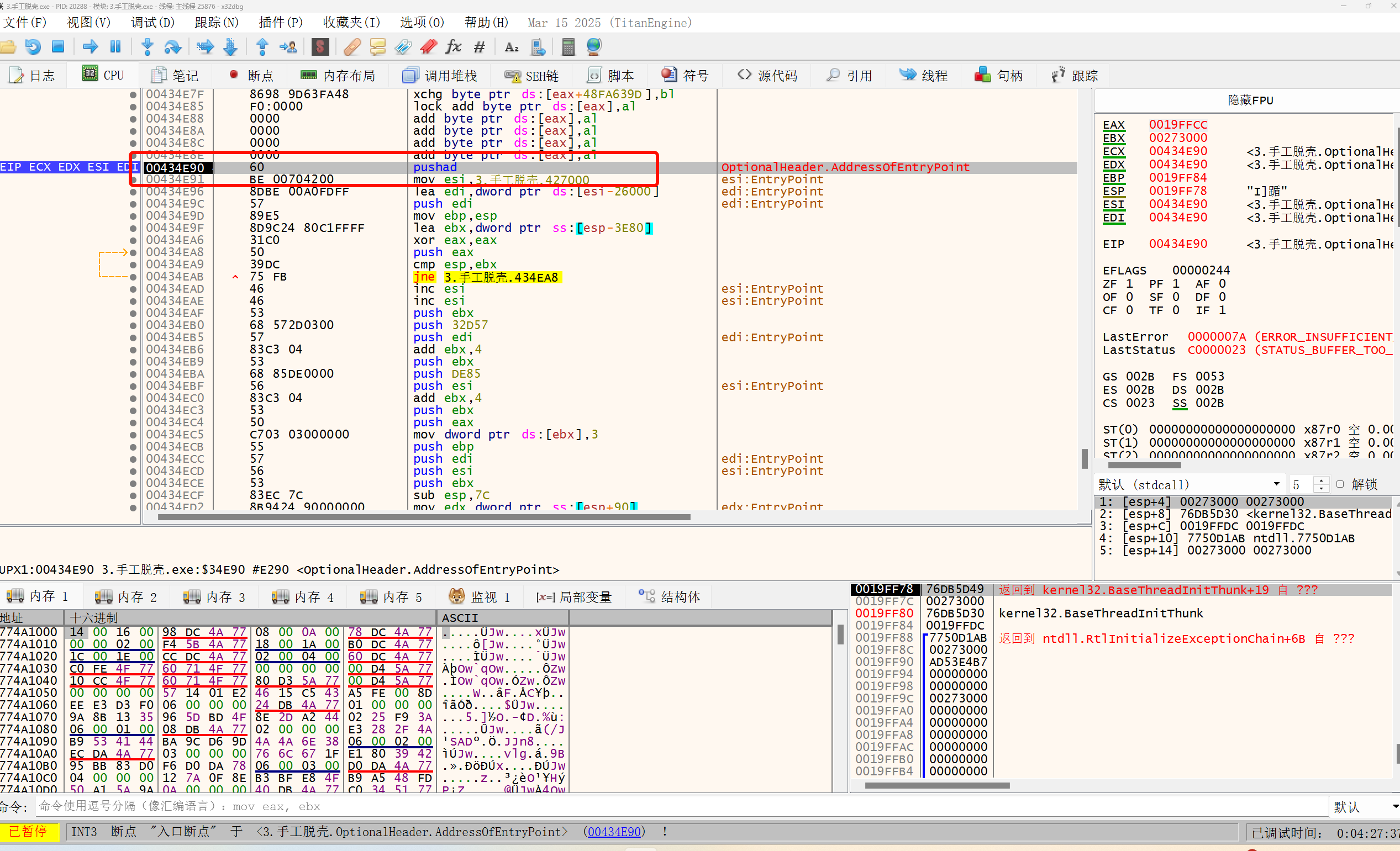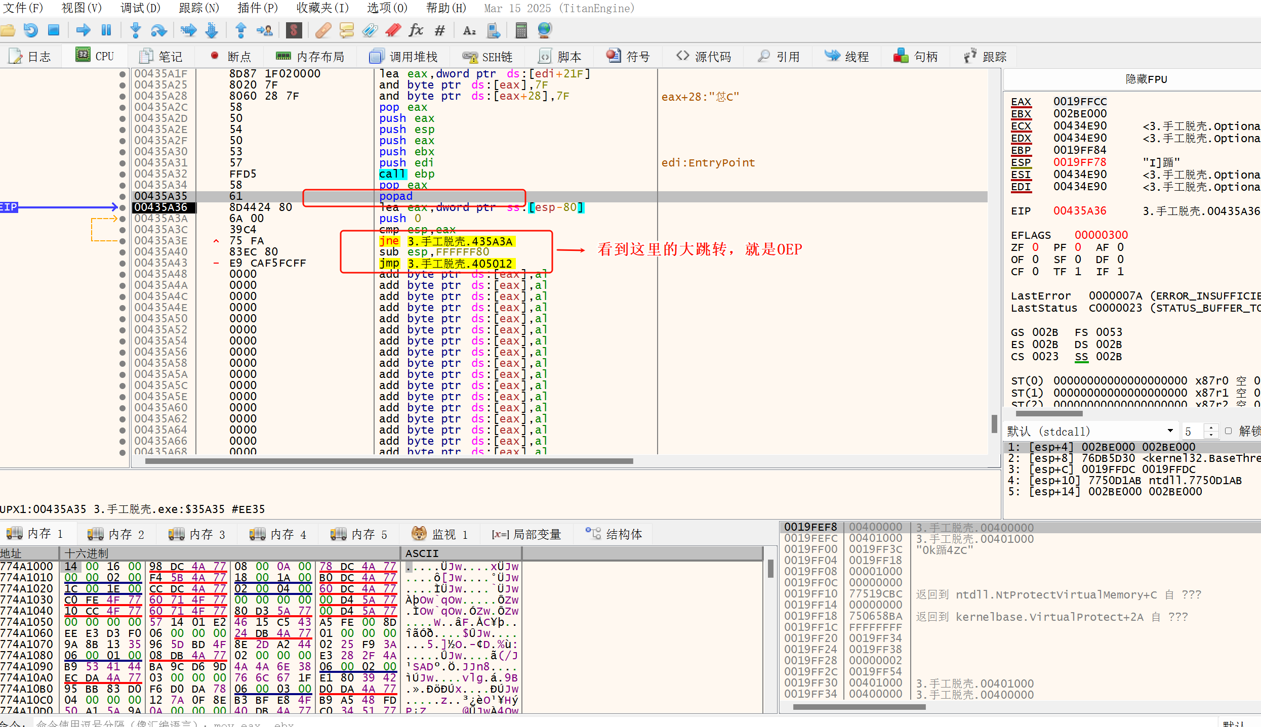 找到 pushad 。pushad = 一次性保存所有通用寄存器到栈。有的时候不是pushad,而是一连串的 push 将通用寄存器入栈也是一样的。