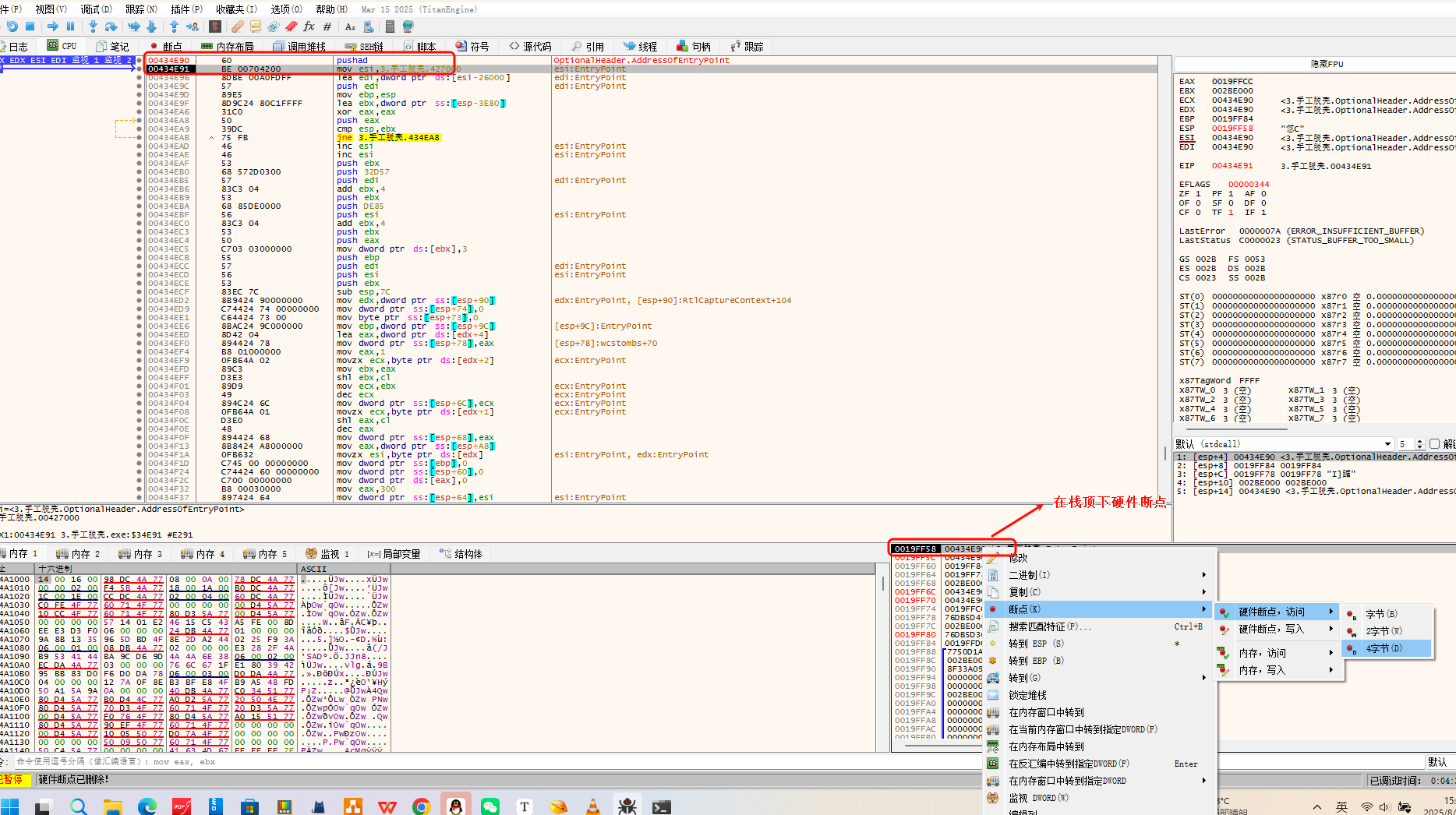 - 将寄存器压栈后就在 ESP/RSP 寄存器所在地址处设硬件访问断点