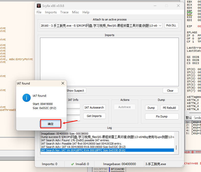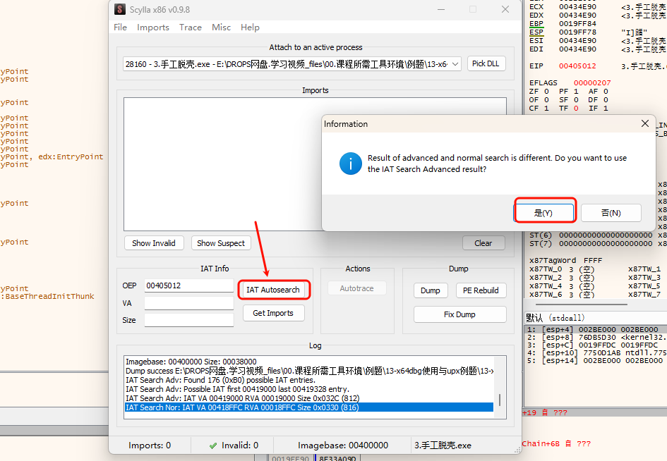 选择 是 后,会显示找到的 IAT 地址及大小: