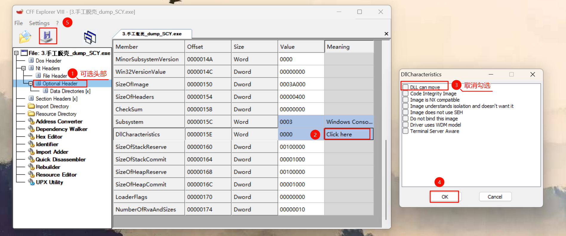 然后修改 Optional Header 的 DllCharateristics,取消勾选 DLL can move。