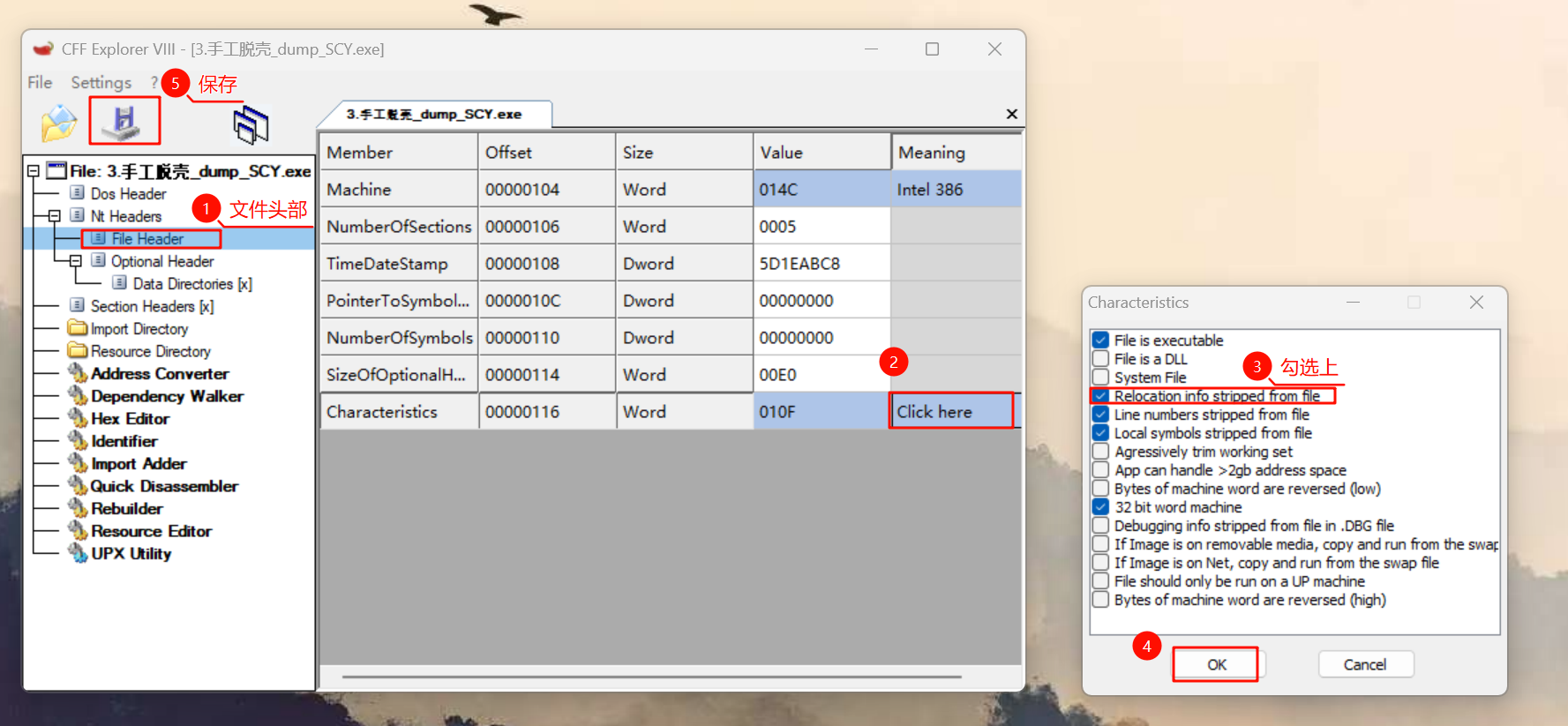 首先修改 File Header 的 Charateristics,勾选 Relocation info stripped from file。