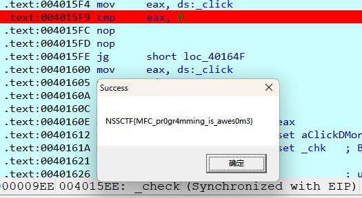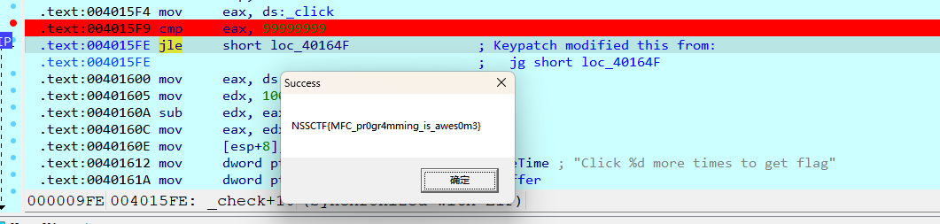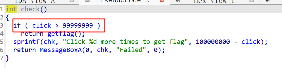 原本代码 :jg short loc_40164F → 如果 _click > 99999999 就跳转,执行 call _getflag。