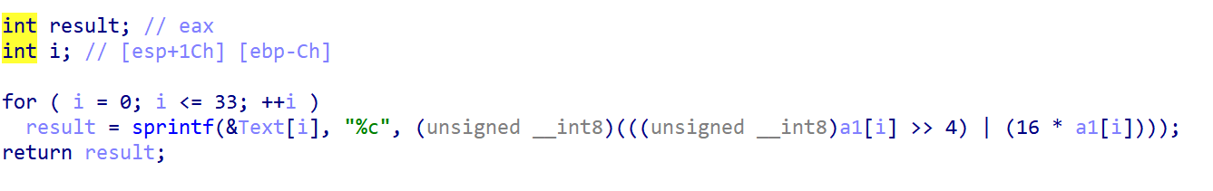 1 2 3 4 5 6 7 8 enc = [-28 , 53 , 53 , 52 , 69 , 100 , -73 , -44 , 100 , 52 , -11 , 7 , 39 , 3 , 118 , 39 , 67 , -42 , -42 , -106 , -26 , 118 , -11 , -106 , 55 , -11 , 22 , 119 , 86 , 55 , 3 , -42 , 51 , -41 ] flag='' for i in range (len (enc)): flag+=chr (((enc[i] & 0xff ) >>4 | (enc[i] & 0xff ) <<4 ) & 0xff ) print (flag)