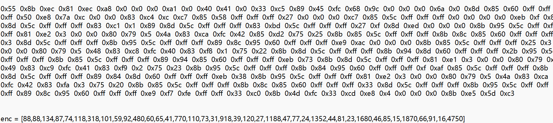 我们可以新建一个文件去掉文件后缀名,把它放到010里面,把上面的机器码序列全部粘进去。就得到了一个二进制文件,我们可以直接把它放到IDA里面,进行分析。这样方便的多,不仅可以看到机器码转成的汇编指令,还可以选中整个函数部分按P重构,就能得到反编译的加密逻辑啦,还是IDA👍