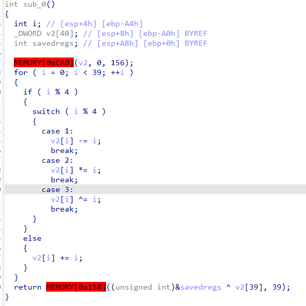 1 2 3 4 5 6 7 8 9 10 11 12 13 14 15 16 17 18 19 20 21 22 23 24 25 26 27 28 29 30 31 32 33 #include <stdio.h> void dec (int v2[39 ]) { for (int i = 0 ; i < 39 ; ++i ) { if ( i % 4 ) { switch ( i % 4 ) { case 1 : v2[i] += i; break ; case 2 : v2[i] /= i; break ; case 3 : v2[i] ^= i; break ; } } else { v2[i] -= i; } } } int main () { int enc[39 ]={88 ,88 ,134 ,87 ,74 ,118 ,318 ,101 ,59 ,92 ,480 ,60 ,65 ,41 ,770 ,110 ,73 ,31 ,918 ,39 ,120 ,27 ,1188 ,47 ,77 ,24 ,1352 ,44 ,81 ,23 ,1680 ,46 ,85 ,15 ,1870 ,66 ,91 ,16 ,4750 }; dec(enc); for (int i=0 ;i<39 ;i++){ printf ("%c" ,enc[i]); } return 0 ; }