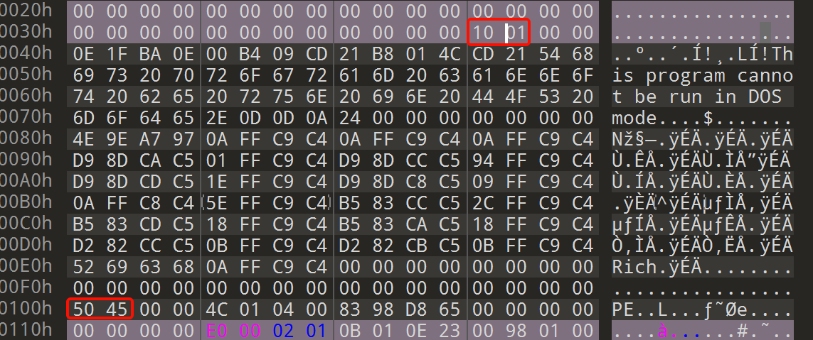 这个e_lfanew指向的偏移地址是错误的,我们能看到 50 45在100h的地方,这里 10 01 00 00 是小端序 ,其值是0x00000110,所以这个偏移错误的指向了0x110,而不是0x100。想要正确指向0x100,就要改成 00 01 00 00