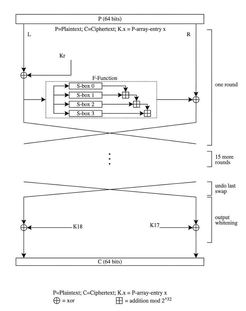 Blowfish的核心加密过程包含 16 轮完全相同的操作,利用了著名的 Feistel 网络结构: