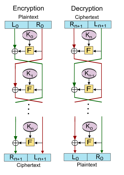 这个加密算法和DES一样,使用的是Feistel来进行分组加密的。