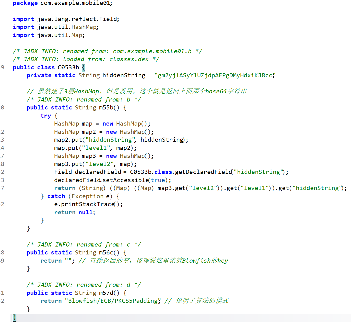 m57d()方法说明了Blowfish的算法模式是ECB/PKCS5Padding